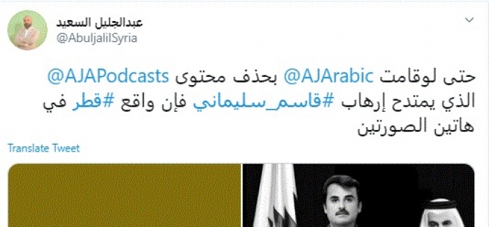 وقال في تغريدة عبر "تويتر" رصدها "المشهد العربي": "حتى لوقامت الجزيرة بحذف محتوى الجزيرة بودكاست الذي يمتدح إرهاب قاسم سليماني فإن واقع قطر في هاتين الصورتين".