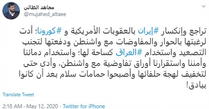 وقال في تغريدة عبر "تويتر" رصدها "المشهد العربي": "تراجع وانكسار إيران بالعقوبات الأمريكية وكورونا؛ أدت لرغبتها بالحوار والمفاوضات مع واشنطن ودفعتها لتجنب التصعيد واستخدام العراق كساحة لها".
