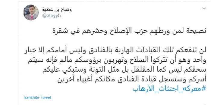 وقال في تغريدة عبر "تويتر" رصدها "المشهد العربي": "نصيحة لمن ورطهم حزب الإصلاح وحشرهم في شقرة لن تنفعكم تلك القيادات الهاربة بالفنادق وليس أمامكم إلا خيار واحد وهو أن تتركوا السلاح وتهربون برؤوسكم ما لم فإنه سيتم سحقكم".