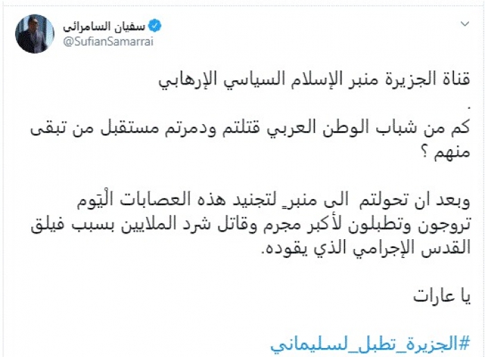 وكتب في تغريدة عبر "تويتر" رصدها "المشهد العربي": "قناة الجزيرة منبر الإسلام السياسي الإرهابي.. كم من شباب الوطن العربي قتلتم ودمرتم مستقبل من تبقى منهم؟ وبعد أن تحولتم إلى منبر ٍ لتجنيد هذه العصابات الْيَوم تروجون وتطبلون لأكبر مجرم وقاتل شرد الملايين بسبب فيلق القدس الإجرامي الذي يقوده. يا عارات".