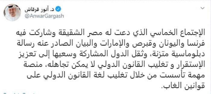وقال في تغريدة عبر "تويتر" رصدها "المشهد العربي": "الاجتماع الخماسي الذي دعت له مصر الشقيقة وشاركت فيه فرنسا واليونان وقبرص والإمارات والبيان الصادر عنه رسالة دبلوماسية متزنة".