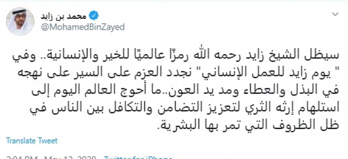وقال في تغريدة عبر "تويتر" رصدها "المشهد العربي": " سيظل الشيخ زايد رحمه الله رمزًا عالميًا للخير والإنسانية.. وفي يوم زايد للعمل الإنساني نجدد العزم على السير على نهجه في البذل والعطاء ومد يد العون".
