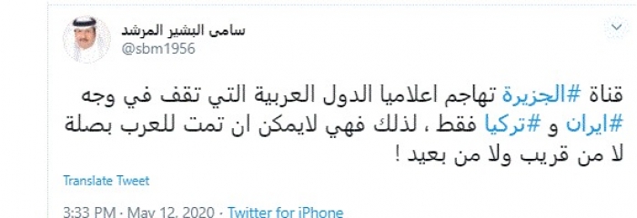وكتب في تغريدة عبر "تويتر" رصدها "المشهد العربي": "قناة الجزيرة تهاجم إعلاميًا الدول العربية التي تقف في وجه إيران وتركيا فقط ، لذلك فهي لايمكن ان تمت للعرب بصلة لا من قريب ولا من بعيد".