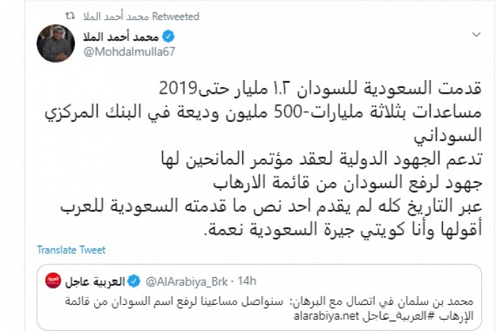 وقال في تغريدة عبر "تويتر" رصدها "المشهد العربي": "قدمت السعودية للسودان ١.٢ مليار حتى 2019 مساعدات بثلاثة مليارات-500 مليون وديعة في البنك المركزي السوداني. تدعم الجهود الدولية لعقد مؤتمر المانحين لها".