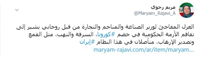 وكتبت رجوي عبر تغريدة لها على "تويتر" رصدها " المشهد العربي": "العزل المفاجئ لوزير الصناعة والمناجم والتجارة من قبل روحاني يشير إلى تفاقم الأزمة الحكومية في خضم كورونا".