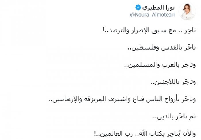 وكتبت المطيري عبر تغريدة لها على "تويتر" رصدها " المشهد العربي":"تاجِر مع سبق الإصرار والترصد، تاجَر بالقدس وفلسطين، وتاجَر بالعرب والمسلمين، وتاجًر باللاجئين".