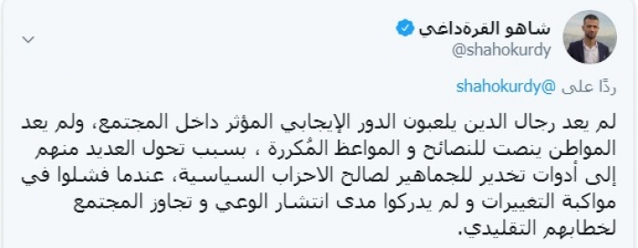 أكد الكاتب الصحفي العراقي شاهو القرة داغي، اليوم الثلاثاء، أن رجال الدين بالعراق لم يعد لهم أي دور مؤثر.