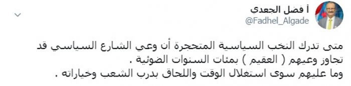 وكتب الجعدي عبر تغريدة له على "تويتر" رصدها " المشهد العربي": "متى تدرك النخب السياسية المتحجرة أن وعي الشارع السياسي قد تجاوز وعيهم ( العقيم ) بمئات السنوات الضوئية".