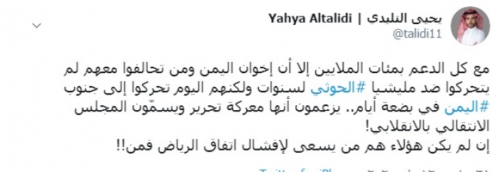 وكتب التليدي عبر تغريدة له على "تويتر" رصدها " المشهد العربي": "مع كل الدعم بمئات الملايين إلا أن إخوان اليمن ومن تحالفوا معهم لم يتحركوا ضد مليشيا الحوثي لسنوات ولكنهم اليوم تحركوا إلى جنوب اليمن في بضعة أيام، يزعمون أنها معركة تحرير ويسمّون المجلس الانتقالي بالانقلابي".