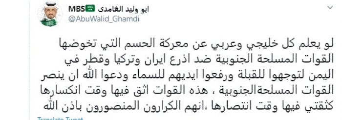 وقال في تغريدة عبر "تويتر" رصدها "المشهد العربي": "لو يعلم كل خليجي وعربي عن معركة الحسم التي تخوضها القوات المسلحة الجنوبية ضد أذرع إيران وتركيا وقطر في اليمن لتوجهوا للقبلة ورفعوا أيديهم للسماء ودعوا الله أن ينصر القوات المسلحة الجنوبية".