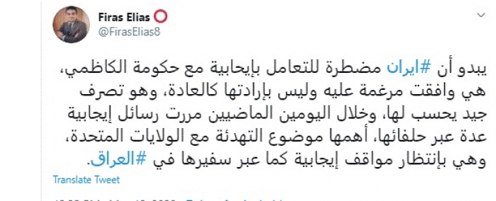 وكتب في تغريدة عبر "تويتر" رصدها "المشهد العربي": "يبدو أن إيران مضطرة للتعامل بإيحابية مع حكومة الكاظمي، هي وافقت مرغمة عليه وليس بإرادتها كالعادة".