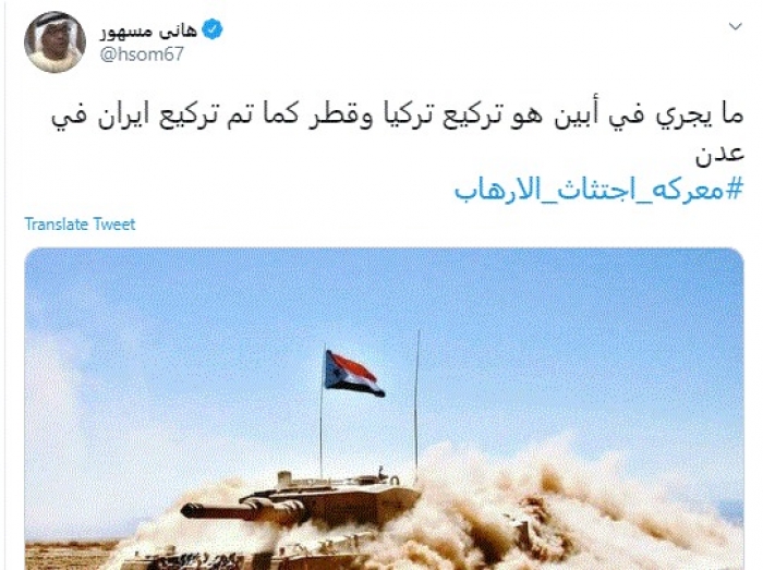 وقال في تغريدة عبر "تويتر" رصدها "المشهد العربي": "ما يجري في أبين هو تركيع تركيا وقطر كما تم تركيع إيران في عدن".