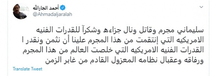 وقال في تغريدة عبر "تويتر" رصدها "المشهد العربي": "سليماني مجرم وقاتل ونال جزاءه وشكرآ للقدرات الفنية الأمريكية التي انتقمت من هذا المجرم علينا أن نثمن ونقدر القدرات الفنية الأمريكية التي خلصت العالم من هذا المجرم ورفاقه وعقبال نظامه المعزول القادم من غابر الزمن".