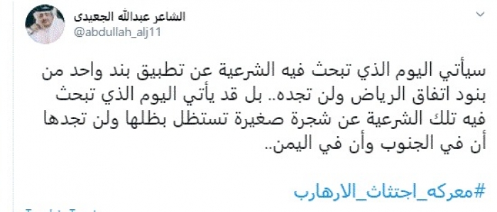 قال الشاعر عبدالله الجعيدي، اليوم، إن حكومة الشرعية ستبحث عن تطبيق بند واحد من اتفاق الرياض ولن تجد ذلك.