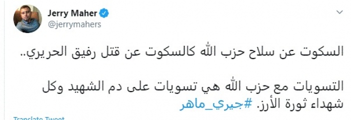 رفض الكاتب الصحفي اللبناني جيري ماهر، اليوم، الحديث عن أي تسويات سياسية مع حزب الله اللبناني، مستنكرًا في الوقت ذاته الصمت على امتلاك حزب الله للسلاح.
