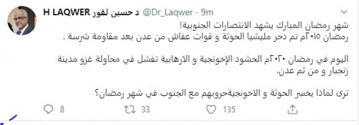 واختتم تغريدته متسائلاً: "ترى لماذا يخسر الحوثة والإخونجية حروبهم مع الجنوب في شهر رمضان؟".
