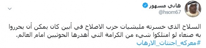 وكتب عبر تغريدة له على "تويتر" رصدها: المشهد العربي": "السلاح الذي خسرته مليشيات حزب الاصلاح في أبين كان يمكن أن يحرروا به صنعاء لو امتلكوا شيء من الكرامة التي أهدرها الحوثيين أمام العالم".