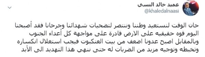 وكتب النسي عبر تغريدة له على "تويتر" رصدها" المشهد العربي": "حان الوقت لنستعيد وطننا وننتصر لتضحيات شهدائنا وجرحانا، فقد أصبحنا اليوم قوه حقيقية على الأرض قادرة على مواجهة كل أعداء الجنوب".