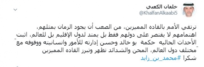 وكتب الكعبي عبر تغريدة له على "تويتر" رصدها " المشهد العربي": "ترتقي الأمم بالقادة المميزين، من الصعب أن يجود الزمان بمثلهم، اهتمامهم لا يقتصر على دولهم فقط بل يمتد لدول الإقليم بل للعالم".
