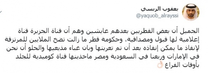 وكتب الريسي عبرتغريدة له على "تويتر" رصدها" المشهد العربي": "الجميل أن بعض القطريين بعدهم عايشين وهم أن قناة الجزيرة قناة إعلامية لها قبول ومصداقية، وحكومة قطر ما زالت تضخ الملايين للمرتزقة لإنقاذ ما يمكن إنقاذه بعد أن تم تعريتها وبان غباء مذيعيها".