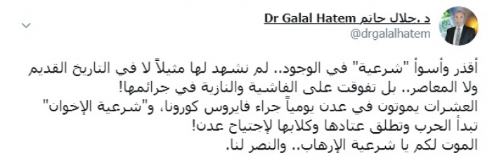 وأضاف:" العشرات يموتون في عدن يومياً جراء فايروس كورونا، و"شرعية الإخوان" تبدأ الحرب وتطلق عتادها و...لاجتياح عدن،... لكم يا شرعية الإرهاب، والنصر لنا".