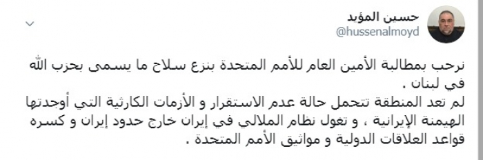 وكتب المؤيد عبر تغريدة له على "تويتر" رصدها " المشهد العربي": "نرحب بمطالبة الأمين العام للأمم المتحدة بنزع سلاح ما يسمى بحزب الله في لبنان".