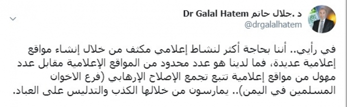 وكتب حاتم عبر تغريدة له على "تويتر" رصدها " المشهد العربي": "في رأيي، أننا بحاجة أكثر لنشاط إعلامي مكثف من خلال إنشاء مواقع إعلامية عديدة، فما لدينا هو عدد محدود من المواقع الإعلامية مقابل عدد مهول من مواقع إعلامية تتبع تجمع الإصلاح الإرهابي (فرع الإخوان المسلمين في اليمن)، يمارسون من خلالها الكذب والتدليس على العباد".