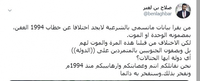 وكتب بن لغبر عبر تغريدة له على "تويتر" رصدها " المشهد العربي":" من يقرأ بيانات ما تسمى بالشرعية لا يجد اختلافا عن خطاب 1994 العفن، بمضمونه الوحدة أو الموت، لكن الاختلاف من قبلنا هذه المرة والموت لهم".