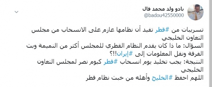 وكتب عبر تغريدة له على "تويتر" رصدها " المشهد العربي": "تسريبات من قطر تفيد أن نظامها عازم على الانسحاب من مجلس التعاون الخليجي، السؤال: ماذا كان يقدم النظام القطري للمجلس أكثر من النميمة وبث الفرقة ونقل المعلومات إلى إيران؟".