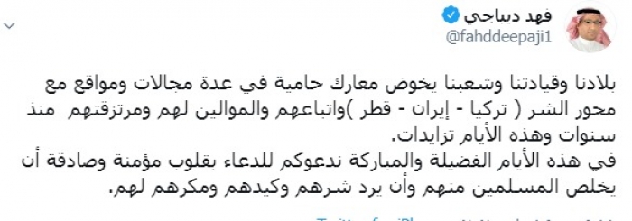 وكتب ديباجي عبر تغريدة له على "تويتر" رصدها " المشهد العربي": "بلادنا وقيادتنا وشعبنا يخوض معارك حامية في عدة مجالات ومواقع مع محور الشر ( تركيا - إيران - قطر )وأتباعهم والموالين لهم ومرتزقتهم منذ سنوات وهذه الأيام تزايدات".