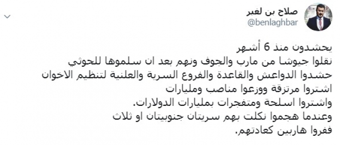 وكتب بن لغبر عبر تغريدة له على "تويتر" رصدها " المشهد العربي": "يحشدون منذ 6 أشهر، نقلوا جيوشا من مأرب والجوف ونهم بعد أن سلموها للحوثي، حشدوا الدواعش والقاعدة والفروع السرية والعلنية لتنظيم الإخوان".