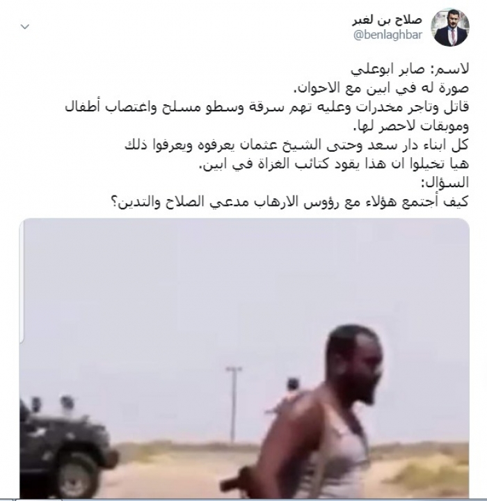 وكتب بن لغبر عبر تغريدة له على "تويتر" رصدها " المشهد العربي": "الاسم: صابر أبوعلي، صورة له في أبين مع الإخوان".