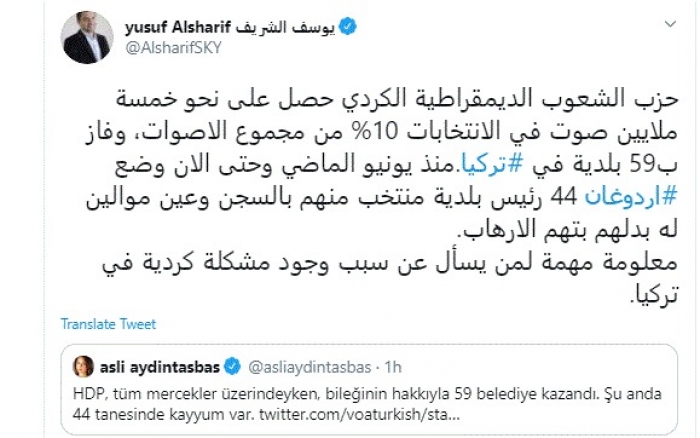 وقال في تغريدة عبر "تويتر" رصدها "المشهد العربي": "حزب الشعوب الديمقراطية الكردي حصل على نحو خمسة ملايين صوت في الانتخابات 10% من مجموع الأصوات، وفاز بـ59 بلدية في تركيا".