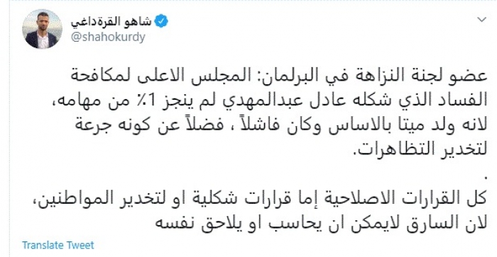وقال في تغريدة عبر "تويتر" رصدها "المشهد العربي": "عضو لجنة النزاهة في البرلمان: المجلس الأعلى لمكافحة الفساد الذي شكله عادل عبدالمهدي لم ينجز 1٪ من مهامه، لأنه ولد ميتًا بالأساس وكان فاشلاً ، فضلاً عن كونه جرعة لتخدير التظاهرات".
