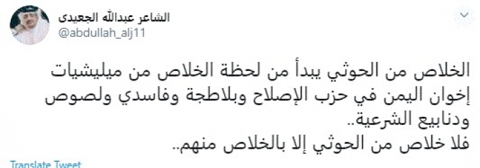 وقال في تغريدة عبر "تويتر" رصدها "المشهد العربي": "الخلاص من الحوثي يبدأ من لحظة الخلاص من مليشيات إخوان اليمن في حزب الإصلاح وبلاطجة وفاسدي ولصوص ودنابيع الشرعية".