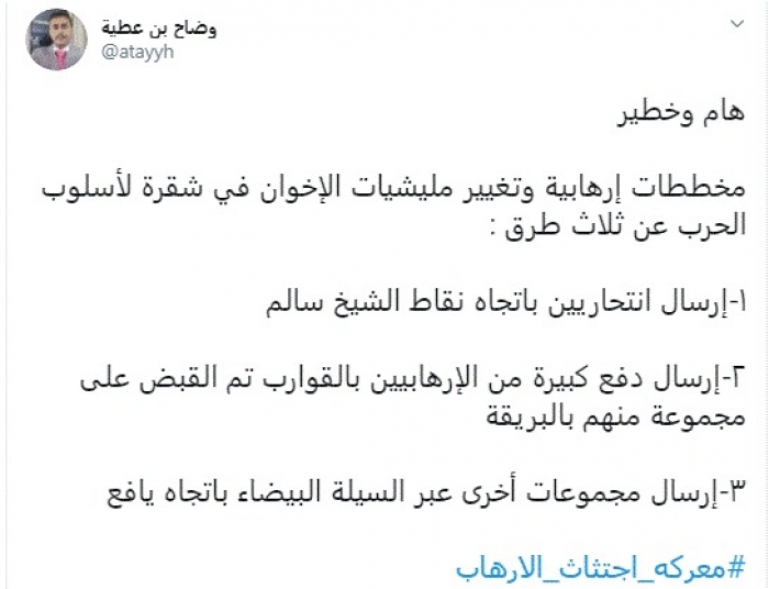 وقال في تغريدة عبر "تويتر" رصدها "المشهد العربي": "هام وخطير؛ مخططات إرهابية وتغيير مليشيات الإخوان في شقرة لأسلوب الحرب عن ثلاث طرق: