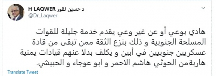 وكتب في تغريدة عبر "تويتر" رصدها "المشهد العربي": "هادي بوعي أو عن غير وعي يقدم خدمة جليلة للقوات المسلحة الجنوبية وذلك بنزع الثقة ممن تبقى من قادة عسكريين جنوبيين في أبين و يكلف بدلاً عنهم قيادات يمنية هاربة من الحوثي هاشم الأحمر وأبو عوجاء والحبيشي".