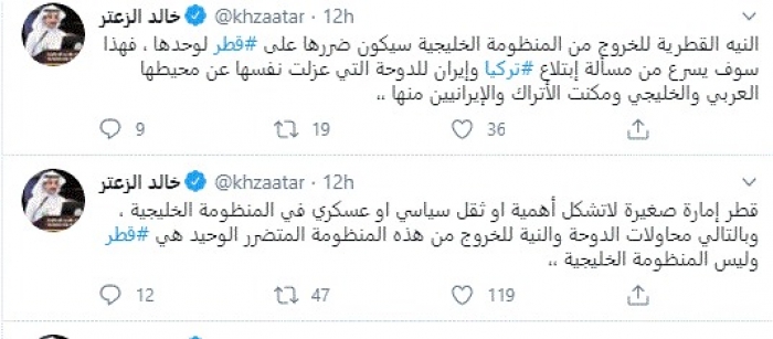 وكتب في تغريدات عبر "تويتر" رصدها "المشهد العربي": "قطر إمارة صغيرة لا تشكل أهمية أو ثقل سياسي أو عسكري في المنظومة الخليجية، وبالتالي محاولات الدوحة والنية للخروج من هذه المنظومة المتضرر الوحيد هي قطر وليس المنظومة الخليجية".