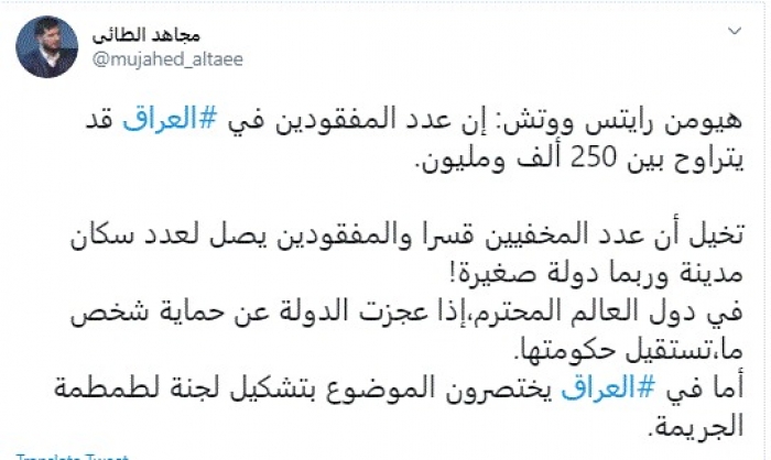 وقال في تغريدة عبر "تويتر" رصدها "المشهد العربي": "هيومن رايتس ووتش: إن عدد المفقودين في العراق قد يتراوح بين 250 ألف ومليون. تخيل أن عدد المخفيين قسرا والمفقودين يصل لعدد سكان مدينة وربما دولة صغيرة".