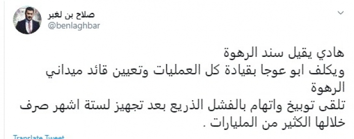 وقال في تغريدة عبر "تويتر" رصدها "المشهد العربي": "هادي يقيل سند الرهوة ويكلف أبو عوجا بقيادة كل العمليات وتعيين قائد ميداني".