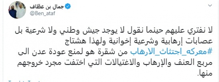 وكتب في تغريدة عبر "تويتر" رصدها "المشهد العربي": "لا نفتري عليهم حينما نقول لا يوجد جيش وطني ولا شرعية بل عصابات إرهابية وشرعية إخوانية ولهذا هاشتاج معركة اجتثاث الإرهاب من شقرة هو لمنع عودة عدن إلى مربع العنف والإرهاب والاغتيالات التي اختفت مجرد خروجهم منها".