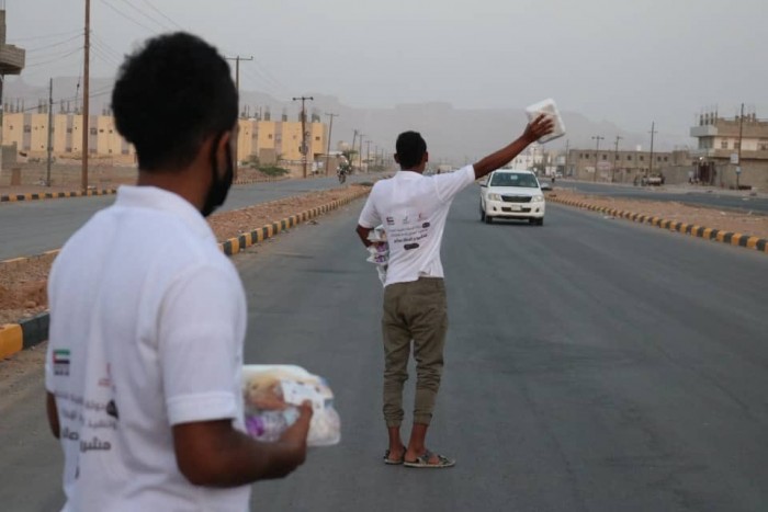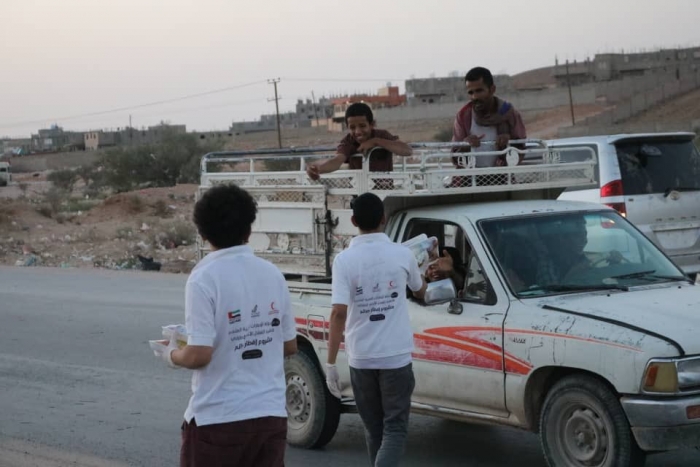 ووزع الهلال الأحمر الإماراتي، اليوم الجمعة، 600 وجبة إفطار الصائم على مداخل ومخارج مدينة عتق في محافظة شبوة.