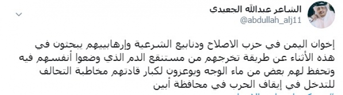 وكتب الجعيدي عبر تغريدة له على "تويتر" رصدها " المشهد العربي":" إخوان اليمن في حزب الإصلاح ودنابيع الشرعية وإرهابييهم يبحثون في هذه الأثناء عن طريقة تخرجهم من مستنقع الدم الذي وضعوا أنفسهم فيه وتحفظ لهم بعض من ماء الوجه".