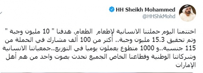 وكتب عبر تغريدة له على "تويتر" رصدها " المشهد العربي": "اختتمنا اليوم حملتنا الإنسانية لإطعام الطعام، هدفنا " 10 مليون وجبة " وتم تحقيق 15.3 مليون وجبة".