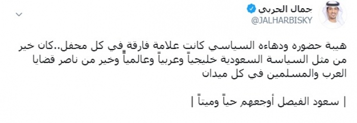 وكتب الحربي عبر تغريدة له على "تويتر" رصدها " المشهد العربي": "هيبة حضوره ودهاءه السياسي كانت علامة فارقة في كل محفل، كان خير من مثل السياسة السعودية خليجياً وعربياً وعالمياً، وخير من ناصر قضايا العرب والمسلمين في كل ميدان".