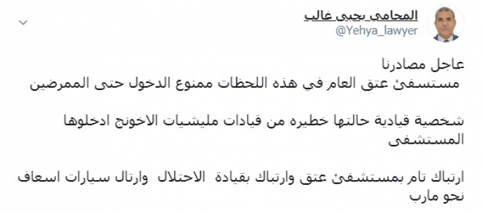 وكتب غالب عبر تغريدة له على "تويتر" رصدها " المشهد العربي": "عاجل مصادرنا، مستشفى عتق العام في هذه اللحظات ممنوع الدخول حتى الممرضين".