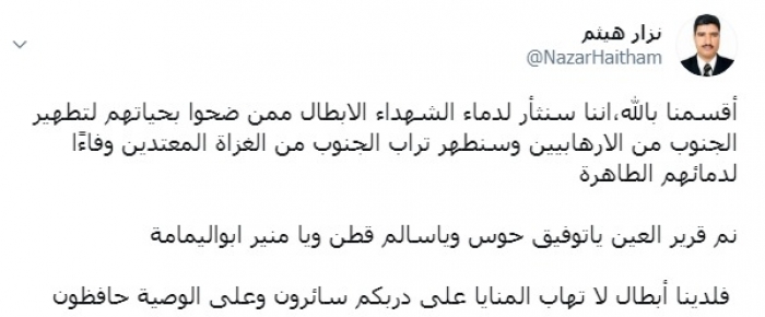 وكتب هيثم عبر تغريدة له على "تويتر" رصدها " المشهد العربي": "أقسمنا بالله، أننا سنثأر لدماء الشهداء الأبطال ممن ضحوا بحياتهم لتطهير الجنوب من الإرهابيين وسنطهر تراب الجنوب من الغزاة المعتدين وفاءًا لدمائهم الطاهرة".