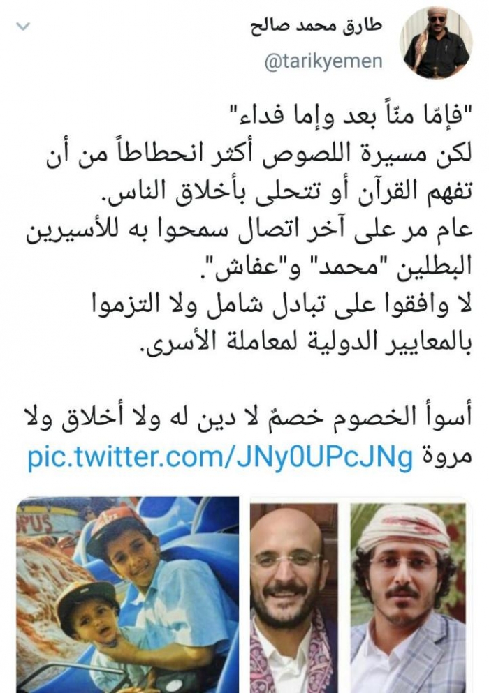 استنكر طارق صالح، قائد المقاومة الوطنية، تعامل مليشيا الحوثي الإرهابية، المدعومة من إيران، مع نجله وشقيقه الأسيرين لدى المليشيا.