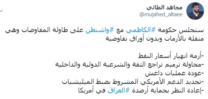 وكتب عبر تغريدة له على "تويتر" رصدها " المشهد العربي":"ستجلس حكومة الكاظمي مع واشنطن على طاولة المفاوضات وهي مثقلة بالأزمات وبدون أوراق تفاوضية".