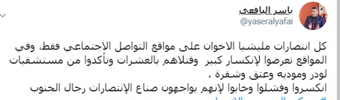وكتب اليافعي عبر تغريدة له على "تويتر" رصدها "المشهد العربي": "كل انتصارات مليشيا الإخوان على مواقع التواصل الاجتماعي فقط، وفي المواقع تعرضوا لانكسار كبير وقتلاهم بالعشرات وتأكدوا من مستشفيات لودر ومودية وعتق وشقرة ".